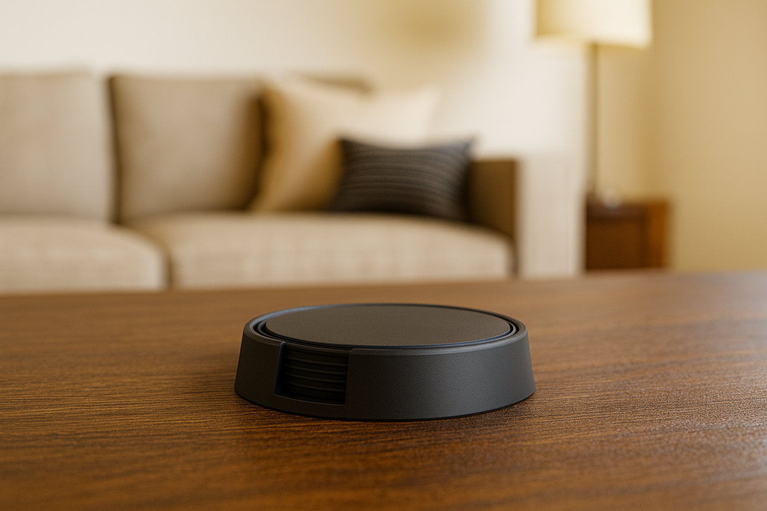Keep your surfaces stylish and protected with this sleek, minimalist coaster set. Each set includes five durable 3D-printed coasters and a matching holder for neat storage. Designed for stability, the holder features three genuine 3M Bumpons on the bottom to prevent slipping and protect your furniture. Perfect for coffee tables, desks, or dining areas, this set combines modern design with practical functionality.